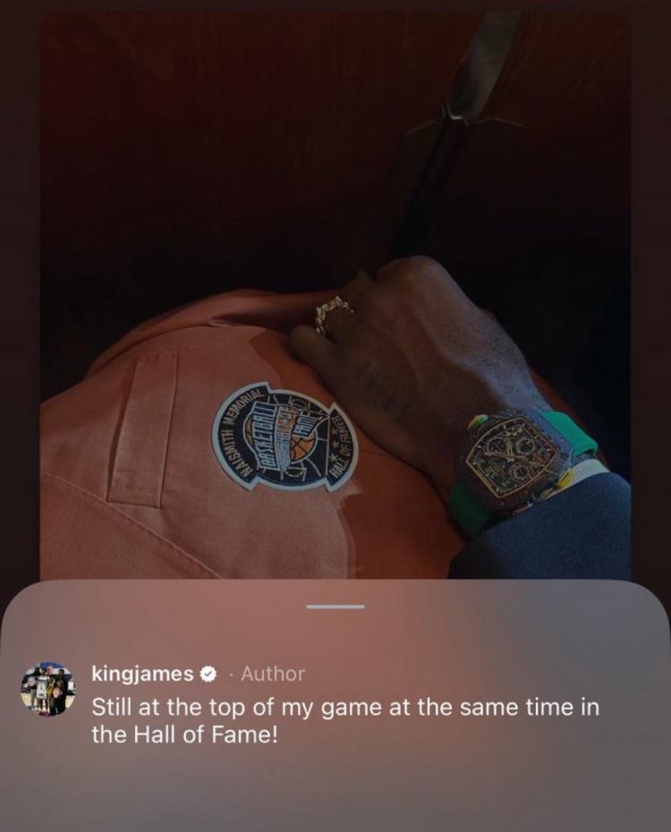 詹姆斯今日更新Instagram,发帖晒出他的名人堂夹克庆祝。在Instagram Story再次对此贴转发时他评论道:“我依然处于巅峰状态,同时已入选名人堂!”