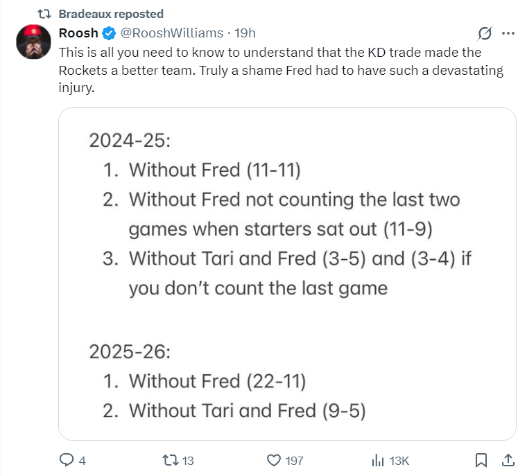 25-26赛季,缺少范弗利特的比赛火箭22胜11负,缺少伊森与范弗利特的比赛9胜5负。